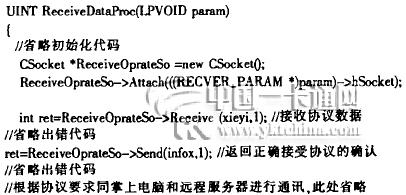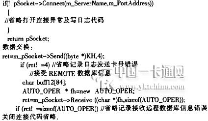 客戶線程啟動后.根據接收到的套接字句柄建立新的套接字,與掌上電腦端進行通訊,接受協議數據,根據協議數據要同遠程數據庫或掌上電腦端進行數據交流.同遠程數據庫服務器進行數據交換是采用ADO組件.以下是關鍵代碼: