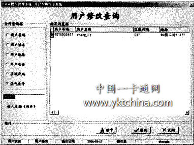 用戶開戶完成后,隨著時間或其他條件的變化而需要修改資料,就需進入用戶修改查詢界面,見圖6。用戶資料修改前,需要先找到該用戶。若用戶有卡,可進行讀卡操作來查找;也可根據查詢條件來進行查找。找到該用戶后,雙擊結果瀏覽框中的用戶信息,將自動進入用戶信息修改窗體。