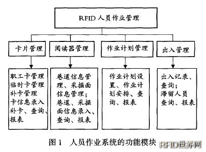 人員安全管理強(qiáng)調(diào)井下作業(yè)過程中人員的安全,通過計(jì)算機(jī)查詢等功能,了解人員的具體位置分布,可通過圖形突出顯示。發(fā)生事故時(shí),可有效地進(jìn)行搶險(xiǎn)救災(zāi)工作,最大限度地保障人員安全。人員作業(yè)管理是利用RFID的識(shí)別功能進(jìn)行的。系統(tǒng)首先要生成閱讀器和卡片等相關(guān)信息,通過系統(tǒng)軟件對(duì)識(shí)別后的數(shù)據(jù)進(jìn)行處理。人員作業(yè)系統(tǒng)按照功能劃分為4個(gè)模塊:卡片管理、閱讀器管理、作業(yè)計(jì)劃管理和人員出入管理,如圖1所示。