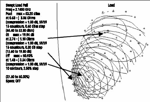 脈沖VNA負載拉移技術被用來測量飛思卡爾公司廣泛的功率晶體管產品,包括170W WCDMA器件MRF7S21170H。該器件的負載拉移功率等高線顯示,1dB壓縮點的脈沖輸出功率高于+53dBm(200W),2.14GHz頻率下的增益為19.94dB(圖5)。由于具有這些技術,MRF7S21170H的最終匹配網絡設計變成非常簡單,只需為同時優化功率密度、增益、效率,以及綜合的匹配網絡而選擇負載和源阻抗。