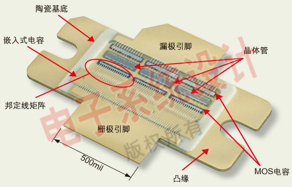 具有封裝內匹配網絡的典型分立射頻晶體管如圖6所示。這個匹配網絡通過將晶體管裸片的低輸入阻抗和輸出阻抗轉換為更實用的輸入阻抗和輸出阻抗值,來提高產品的易用性及性能。這些匹配網絡采用小直徑邦定線和金屬氧化物半導體(MOS)電容來構建,最大的射頻/微波功率晶體管包含有100到200個邦定線和幾個MOS電容。大功率RF IC則采用片內螺旋電感、電容和傳輸線來構建匹配網絡。
