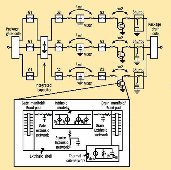 開發這些封裝晶體管的非線性電熱模型,使最復雜的測量和仿真技術成為可能。成功的建模還必須解決一些問題,包括匹配網絡中組成部分之間以及邦定線陣列之間的電磁交互作用、熱管理、器件熱模型與電模型的自相容集成,以及建立晶體管本身的非線性模型等。