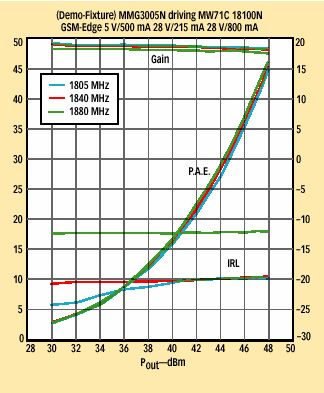 圖13為其中一個示范電路。這個電路被用來演示完整的1,800MHz GSM產品系列,包括驅動MW7IC18100N大功率RF的ICMMG3005 GPA。MMG3005是A類偏置InGaP HBTC,在1dB壓縮下具有+30dBm額定輸出功率。MW7IC18100N是HV7 LDMOS兩級RF IC,在1dB壓縮下具有100W(+50dBm)的額定輸出功率。綜合來看,這兩個器件創建了高性能的1,800MHz GSM系統,具有近50dB的增益、37%的線路效率,以及+46dBm輸出功率下的1.5% EVM性能,如圖14和15所示。低成本塑料封裝、緊湊的電路版圖以及使用最少的RF器件使得這一應用為成本敏感的GSM市場提供了理想的解決方案。