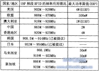 各國政府除了對RFID的Reader(讀寫器)的發(fā)射功率作了相關規(guī)定外,對占用帶寬、調(diào)制方式、調(diào)頻數(shù)目均作了相關的規(guī)定。