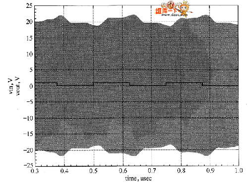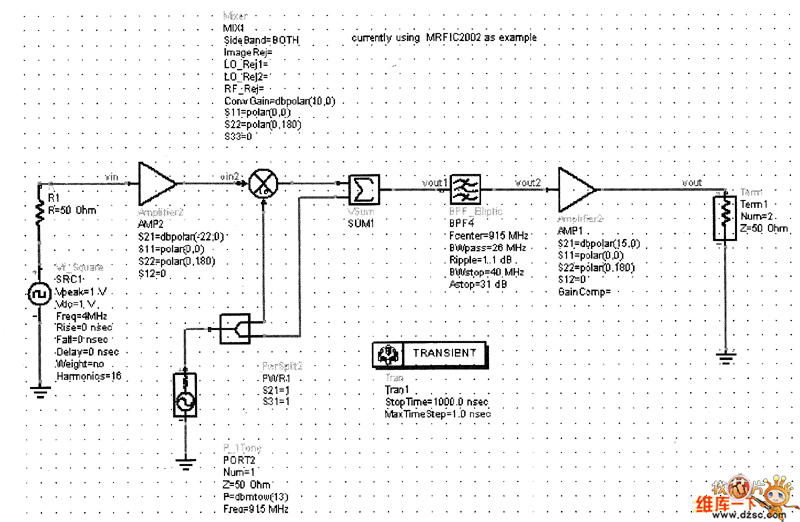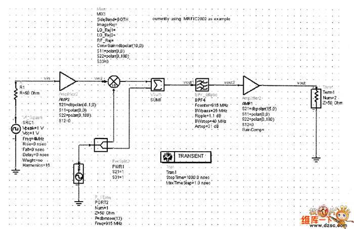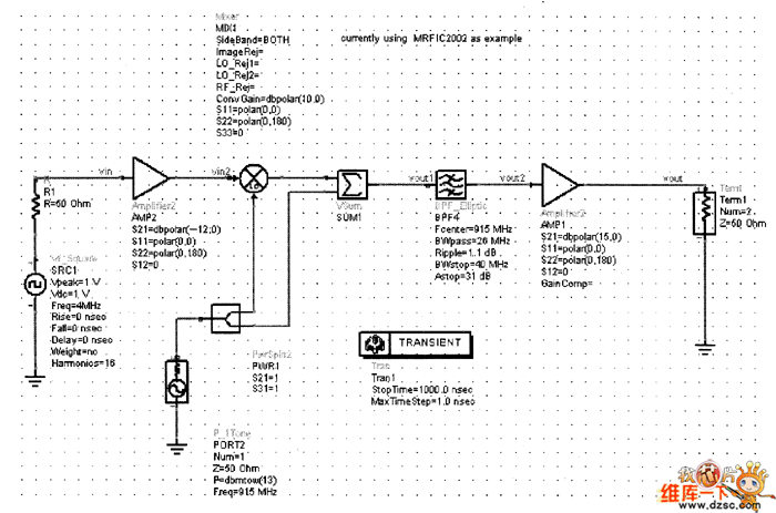 將放大器AMP2的增益設(shè)為-12dB,即S21=dBpolar(-12,0),仿真原理圖如圖2所示,輸出波形如圖3所示。