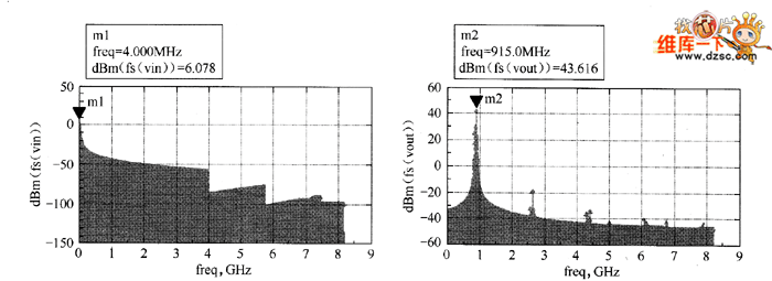 接下來,把時域特性曲線轉(zhuǎn)換到頻域。選擇Trace Options,設(shè)定為:dBm(fs(…)),這里使用了函數(shù)方式fs(),即傅里葉變換,并將數(shù)據(jù)用dBm表示。另外,將Trace Type設(shè)置為Spectral,輸入輸出波形的傅里葉變換圖像如圖8所示。
