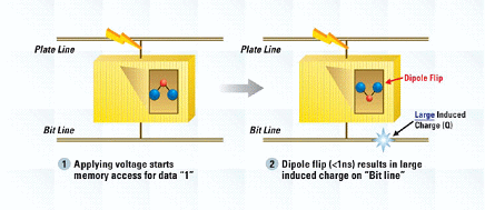 為重新寫入新的數據于FRAM的記憶格中, 雙極可很容易經由位線或電路板在線的電壓而產生正極或負極。雙極輕彈產生非常迅速,于十億分之一秒內,因此可快速地存取內存數據。 FRAM的記憶格易于快速地建立數據,顯示出不需要設計復雜的EEPROM及快閃記憶的浮動閘技術, 即可以鐵晶體管完成。