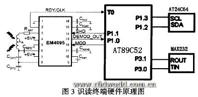 微控制器負責啟動EM4095并接收由EM4095解調的編碼數據。采用AT89C52作為微控制器,其內部集成了8KB的Flash程序存貯器,256B的RAM, 具有低功耗工作模式。EM4095的DEMOD OUT端接P1.0,EM4095的SHD接P1.1EM4095輸出的參考時鐘信號RDY/CLK端接TO,用作解碼的同步時鐘。AT89C52從電子標簽讀取來的編碼數據存貯在EEPROM芯片 AT24C64中。可司通過 MAX232進行電平轉換,實現與上位機的通信。識讀終端硬件原理見圖3。