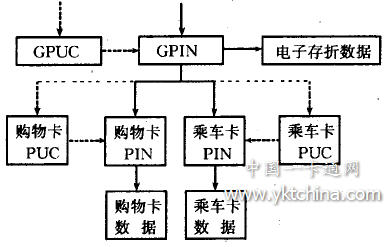 為了能驗證ICC持卡人身份的合法性,必須給ICC設置個人識別號(PIN)。在插人IFD時,IFD必須確認Icc的合法性。在多功能IC卡應用系統(tǒng)中,ICC應有全局PIN(GPIN)和局部PIN (I.PIN)兩種。GPIN處于系統(tǒng)的最高層次,一旦非法試探達到極限次數(shù),整卡自鎖不能使用,須通過全局個人解鎖碼(GPUC)將卡打開后才能使用。LPIN處于某一具體應用層次,因非法試探而導致自鎖時,只鎖住該層次的應用,其他應用不受影響。ICC局部自鎖后,須通過相應的局部個人解鎖碼(LPUC)才能打開。圖4為多功能IC卡應用系統(tǒng)ICC的PIN應用示意圖。