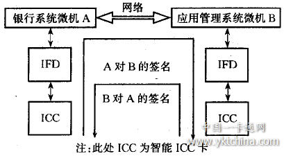 銀行系統(tǒng)與應用管理系統(tǒng)之間的交易是一種電子商務活動,其首要問題是如何確保信息的保密性、傳輸安全性、交易雙方身份的合法性以及交易雙方的不可抵賴性等。依據(jù)密碼學的三種編碼技巧,可對信息本身及其傳輸文件做加密處理:采用“公鑰密碼十時間特征”方案實現(xiàn)數(shù)字電子簽名來確立信息收發(fā)雙方的身份合法性和不可抵賴性。由于智能IC卡本身具有MPU甚至CAU,處理能力十分強,可直接使用智能IC卡作簽名和驗證運算,即銀行方和應用管理系統(tǒng)方都有一張經(jīng)過CA (Certificate Authority)認證的簽名IC卡。這樣,就避免了在PC機上實現(xiàn)數(shù)字簽名所具有的病毒侵擾、PC機操作系統(tǒng)本身的開放性及安全缺陷、個人機并非個人使用等不安全因素,因而交易十分安全可靠。智能卡數(shù)字簽名子系統(tǒng)組成圖如圖5所示。