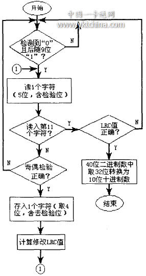 這里存在如何檢測、界定時鐘周期的起始位置、中間位置問題,各種卡的做法并不一致.H4001沒有專門的硬同步信號,不能檢測特殊信號作為起始標志,而是規定64位數據位的前9位固定為全“1”,最后1位設定為“0”,作為起始和結束標志或設定為同步信息.分析連續的若干位“1”和連續若干位“0”,其波形非常相似,所以實際解碼時,應該先檢測到1位“0”,再接著檢測連續的9位“1”,那么可以肯定,后續的54 個信息位便是40位真正的數據和14位相關的奇偶校驗位,有關數據排列順序見文獻[4].可以想象,這里不應該實際上也不可能再次出現1位“0”后跟隨連續的9位“1”.接下來是最后1位,必須是“0”,如此繼續下一循環,否則便是出錯.為了提高效率,可以在循環內邊檢測校驗,邊解碼保存H4001卡的信息,其程序流程如圖4所示.