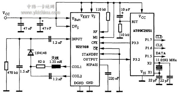 射頻卡的讀寫需要由射頻卡基站芯片來完成數據的調制、發射和射頻的接收以及數據的解調任務.ATMEL公司生產的U2270B是一種低成本、性能完善的低頻(100—150 kHz)射頻卡基站芯片,采用Man—chester編碼和雙相編碼,可用于讀取H4001 RFID卡.參照文獻[3]和[5],針對H4001 RFID卡,采用U2270B設計的射頻識別卡讀取模塊的電路見圖3.