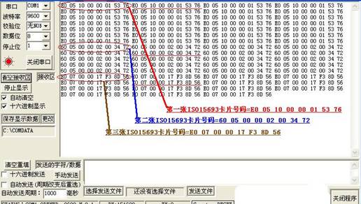讀寫器讀取ISO 15693卡片后將把卡片的數據通過RS232的方式送給后臺的PC計算機或數據控制器等。如下所示為讀寫器先后讀取不同廠家、當符合ISO15693基本西醫標準的幾張ISO 15693卡片的情況。(注意:數據為16進制顯示)