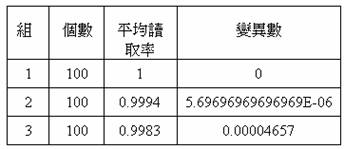 三組分別讀取ㄧ百次,各自紀錄每次讀取率如表1。