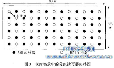 把所有的讀寫器分為兩組,每組39個,經過分組之后的讀寫器的拓撲圖如圖3。圖中A,B兩組的讀寫器數目相同,拓撲結構相似,相鄰節點的最小距離是8.484m,大于相鄰節點的讀寫距離之和4+4= 8m,滿足防止讀寫器對標簽干擾的距離要求。