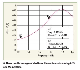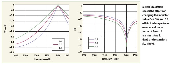 圖6所示為理想的(理論)頻率特性,即均衡器能提供一個正的增益斜率以抵消圖1中放大器在大約1.0到1.3GHz.范圍內帶來的負斜率特性曲線。借助于計算機輔助工程(CAE)軟件工具和利用Agilent公司的先進設計系統(ADS)3套裝軟件的二維電磁(EM)仿真器(包含不同廠商提所供器件的可用散射參數),通過結合實際的布局仿真構造出集總元件均衡器模型,對補償過程進行研究。因此,電路的協同仿真包含了類似配線寄生元件與電感Q值得非理想元件。此仿真中包含電感的散射參數來自Coilcraft4(www.coilcraft.com),電容的散射參數來自American Technical Ceramics 5(www.atcceramics.com),放大器的散射參數來自Sirenza Microdevices1(www.sirenza.com)。