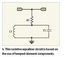 斜率的調整方式有二:改變LC取值(保持一致的諧振頻率)或者改變π型衰減器取值。但是在較高的頻率時,均衡器拓撲結構存在兩個弊端,即PCB布線的寄生現象與非理想的集總元件性能。在1GHz時,筆者發現電路的搭建十分困難并且不能獲得正向的增益-頻率斜率。但是,以犧牲回波損耗為代價,通過使用更簡單實用的均衡器拓撲結構(圖3)可減少元器件的數量,從而降低寄生元件、焊盤電容以及非理想元件特性所帶來的影響。