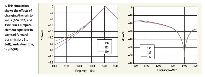 對于高于2GHz的頻率來說,不存在如此小值的電感來獲得足夠高的諧振頻率。為了避免頻率在2GHz以上時電路布線中的寄生現象與集總元件性能的相關問題,我們選擇了集總元件型式的分布式均衡器(圖4),用印刷諧振器可代替LC集總諧振電路,諧振頻率決定諧振腔長度,諧振品質因素(Q)決定諧振腔寬度,從而決定均衡器的斜率。此拓撲結構的頻率上限受制于電阻取值,而在這樣情況下,運用類似低溫共燒陶瓷(LTCC)技術等襯底技術使得印刷電阻的應用變為可能。此時必須引起注意的是:微帶諧振器在何處接地以及諧振腔長度是否為推薦值。圖5所示為該集總元件均衡電路的理想頻率特性仿真,其中集總元件電路中S21的頻率特性隨電阻值的變化而變化。