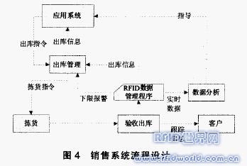 銷售系統(tǒng)中利用RFID技術,主要是物品從倉庫售出后到達客戶手中的過程。而在制造企業(yè)中,主要涉及到的是出庫管理的過程。具體描述如圖4。