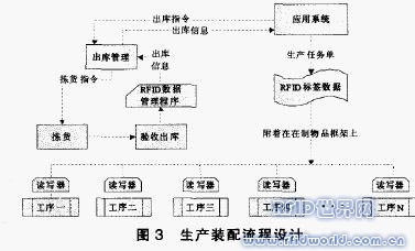 生產裝配系統(tǒng)中,依據(jù)應用系統(tǒng)產生的生產任務單揀貨出庫。從應用系統(tǒng)中發(fā)出揀貨指令,揀貨驗收后出庫。出庫時通過RFID數(shù)據(jù)管理程序,根據(jù)出庫信息自動的修改應用系統(tǒng)中的相關數(shù)據(jù),保證物流和信息流的一致性。根據(jù)應用系統(tǒng)中數(shù)據(jù)設計的電子標簽,安裝在在制物品框架上,進入流程中的工序。此處的工序一般指的是具有成型或半成型的工序,因為在一些煉制的過程中,無法使用標簽。在關鍵工序設置的讀寫器能夠讀取標簽信息,使工序能嚴格按照標簽中的指示進行,減少錯誤率。在成品下線時,可以把標簽進行回收處理,減少使用成本。也可以保持在成品中,改寫其中的數(shù)據(jù),為下一步的銷售和售后進行服務。