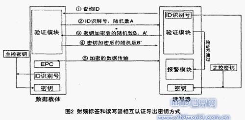 實現射頻標簽和讀寫器的相互認證,目前用的比較多的是導出密鑰”的認證,每個射頻標簽(數據載體)使用不同的密鑰來保護,并在射頻標簽生產過程中讀出其序列號,使用加密算法和主控密鑰計算出密鑰K,從而完成了射頻標簽的初始化過程。這樣每個射頻標簽都擁有了一個與自己識別號和主控密鑰相關的密鑰。