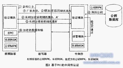 鑒于導出密鑰的認證方式的上述缺點,做了以下改進,采用基于PKI的中間件雙向認證方案:射頻標簽與讀寫器的相互認證由RFID中間件實現;合法的產品發送方(是指生產廠家和數據載體中指定的接收方)通過指定或修改數據載體中的接收方公鑰MPK來指定下一個接收方;只有合法的接收方通過自己的中間件才可以讀取標簽中的信息;接收方通過認證后,就可以修改數據標簽的公鑰MPK,成為了合法的產品發送方。