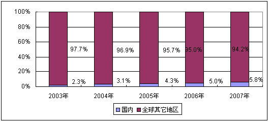 圖3 2003-2007年中國集成電路設(shè)計業(yè)在全球中所占份額增長情況