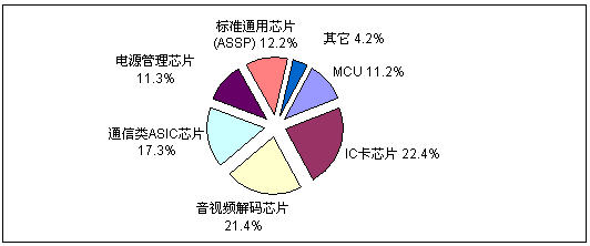 目前中國集成電路設(shè)計業(yè)產(chǎn)品結(jié)構(gòu)上,仍以IC卡芯片和音視頻解碼芯片為主,2007年這兩類產(chǎn)品仍占整個設(shè)計業(yè)產(chǎn)品銷售收入的43.8%。除這兩大類產(chǎn)品外,通信類ASIC芯片、MCU、電源管理芯片以及標(biāo)準(zhǔn)通用芯片(ASSP)也是目前國內(nèi)集成電路設(shè)計企業(yè)開發(fā)的主要產(chǎn)品。