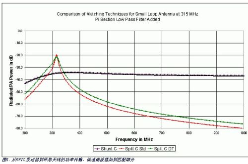 圖3所示是匹配于315MHz時,該匹配網絡的RF功率傳輸特性曲線。功率傳輸特性曲線是由源電阻(RS)將功率傳輸到一個負載阻抗(RL+XL)的表達式計算的,負載阻抗是由匹配網絡變換的環形天線阻抗。