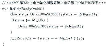 程序執(zhí)行完Init_System()函數后執(zhí)行RcChipReady函數。此函數的功能是初始化MF RC630芯片。