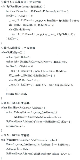在本系統(tǒng)中,主要是將標準的MF RC500軟件開發(fā)包進行移植來完成MF RC632驅動的編寫。在本系統(tǒng)中使用的是SPI總線,所以只要將MF RC500標準軟件開發(fā)包中對寄存器讀/寫的函數改成SPI總線的讀/寫函數即可。在本系統(tǒng)中主要是增加了SpiSendByte()和SpiReByte()函數,同時修改了 ReadRawRc(uchar Address)和WriteR-awRc(uchar Address,uchar value)函數。部分代碼如下: