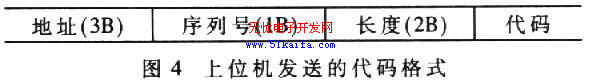 為提高向ATMELGAl28L的FLASH和E2PROM寫代碼的效率和便于從E2PROM向FLASH寫代碼,上位機傳送給下位機的代碼采用圖4所示的格式。