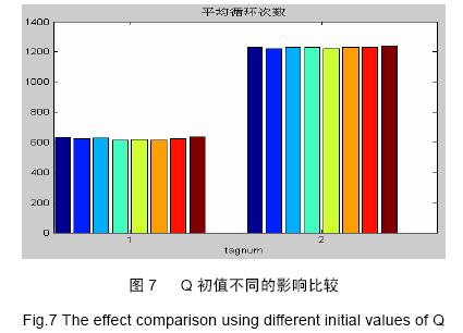 采用EPC Gen2 標(biāo)準(zhǔn)中的算法優(yōu)勢(shì)一是系統(tǒng)的總體識(shí)別時(shí)間較少,系統(tǒng)吞吐率高;二是閱讀器中初始幀長(zhǎng)值(即Q 值)的設(shè)置不受限制,如圖7。圖7 中橫軸1 和2 分別代表標(biāo)簽數(shù)200 個(gè)和400 個(gè),Q 初值分別取1-8 的變化,發(fā)現(xiàn)最終的識(shí)別時(shí)間幾乎無差別,這主要就是算法自適應(yīng)調(diào)整的優(yōu)勢(shì)。采用EPC Gen2 標(biāo)準(zhǔn)中的算法劣勢(shì)是系統(tǒng)由于調(diào)整幀長(zhǎng)過于頻繁而造成功耗的增加[10]。