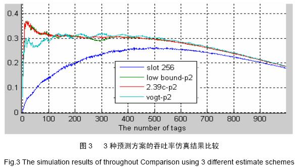 其中,c1、ck、c0 為實(shí)際測(cè)得的成功、空閑、沖突時(shí)隙數(shù)值。在標(biāo)簽數(shù)N 取值范圍[C1+2*CK,……,2*(C1+2*CK)]內(nèi)找到最小的ε值,所對(duì)應(yīng)的N 值就是預(yù)測(cè)的標(biāo)簽數(shù)。圖3 分別給出采用Lowbound、Schout、Vogt 三種不同的標(biāo)簽數(shù)預(yù)測(cè)實(shí)現(xiàn)方案的系統(tǒng)仿真結(jié)果,它們均先預(yù)測(cè)確定現(xiàn)場(chǎng)可能的標(biāo)簽數(shù)后再來設(shè)定最佳信息幀長(zhǎng)度,并重復(fù)閱讀100次。與FSA(即信息幀長(zhǎng)度固定為256)相比,可以看出基于標(biāo)簽數(shù)預(yù)測(cè)的系統(tǒng),系統(tǒng)閱讀吞吐率有明顯改善。