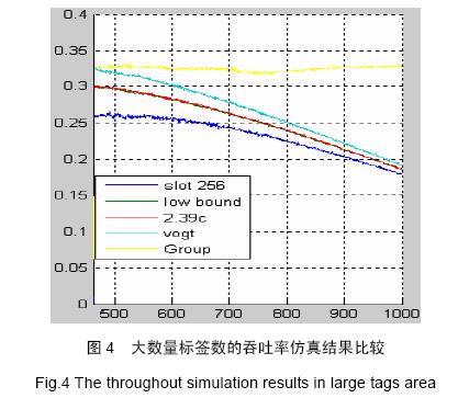 圖4 是對(duì)現(xiàn)場(chǎng)有大數(shù)量標(biāo)簽(大于500)時(shí)采用分組算法和Lowbound、Schout、Vogt的預(yù)測(cè)方案比較仿真結(jié)果。可以看出采用分組算法的系統(tǒng)吞吐率在標(biāo)簽數(shù)大于500 的時(shí)候可以達(dá)到很高,而其它幾種則降得很快。因此如果用在大規(guī)模的標(biāo)簽識(shí)別時(shí)使用分組算法可以有效的提高系統(tǒng)的識(shí)別效率。
