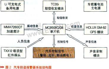 如圖2所示:以MC9S08QG8單片機為核心,輔以MMA7260QT加速度模塊、HOLUX GM-82 GPS模塊、TC35i GSM Modem模塊等功能模塊實現對汽車的實時監控。電源部分擬采用車載蓄電池做主電源;一旦主電源被切斷,即切換到內置電池供電,進入節能模式,有效工作達數月以上。