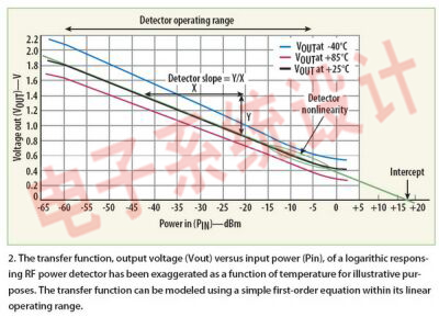 考慮溫度上圖2中這一假設(shè)的檢測器的行為。在輸入功率為-10 dBm時,從約為室溫到-40 ℃或+85℃,輸出電壓隨溫度的變化大約為100 mV。根據(jù)早先對檢測器坡度計算為-25mV/dB,這相當(dāng)于在± 4 dB測量功率下的偏差,這一偏差對大部分使用系統(tǒng)而言實在太大(現(xiàn)實的RF檢測器通常也有介于0和+/-0.5 dB之間的溫度漂移)。實踐中,所需要的是傳遞函數(shù)具有最小漂移隨溫度的檢測器。這將保證在工作溫度范圍以上的常溫下實現(xiàn)校準過程也將是有效的。這使得發(fā)射機在常溫下實現(xiàn)工廠校準,并在炎熱或寒冷溫度下避免昂貴而耗費時間的校準周期。
