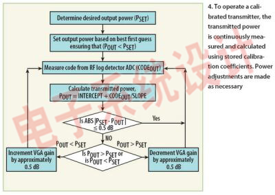圖4 表示了校準之后,在發(fā)射機中精確設(shè)定功率的流程圖。在這個例子中,其目標(biāo)就是要有一個發(fā)射功率誤差,其小于或等于±0.5 dB。最初,在最佳優(yōu)先推測的基礎(chǔ)上來設(shè)定輸出功率水平。接下來,對該檢測器的ADC進行采樣。從存儲器取回SLOPE和INTERCEPT的值,并且計算所發(fā)射的輸出功率水平。如果輸出功率不在設(shè)定功率水平PSET的±0.5 dB之內(nèi),使用電壓可變衰減器(VVA)增加或減少輸出功率大約0.5 dB。在這里使用術(shù)語“大約”是因為有可能VVA本身具有非線性傳輸函數(shù)。再次測量發(fā)射功率,并進一步增加功率,直到發(fā)射功率誤差小于±0.5 dB。一旦功率水平在容差之內(nèi),進行持續(xù)監(jiān)測,并且如果有必要的話,要進行調(diào)整(例如,如果信號鏈中的一個組分隨溫度有顯著的增益漂移)。