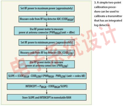 圖3 表示了發(fā)射機校準的流程圖,該圖與圖1中所述相似。簡單而快捷的兩點校準允許大致設(shè)定功率水平(但功率水平必須進行準確測量)。其有效性依賴于集成RF檢測器隨溫度和頻率變化的穩(wěn)定性,并具有可采用公式1進行建模的可預(yù)測響應(yīng)。發(fā)射機的工作功率范圍也應(yīng)符合RF檢測器的線性工作范圍。
