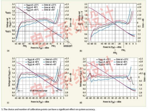 圖5 (c)表示了如何在犧牲線性度的情況下,移動校準點來增加動態(tài)范圍。在這種情況下,校準點為-4和-60 dBm。這些點在器件線性范圍的底部。再次,在+25℃下校準點0 dB誤差是顯而易見的。還要指出,超過了AD8318保持小于±1 dB的誤差,在+25°C下將范圍擴展至60 dB,并且在該溫度以上為58 dB。這一辦法的缺點是,增加了整體測量誤差,尤其是在檢測器范圍頂部的情況下。