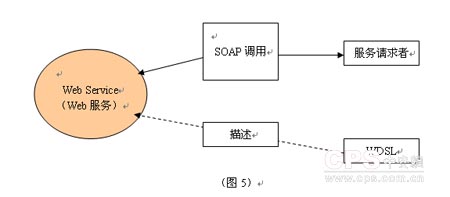 簡單的說,一個(gè)Web服務(wù)(圖5)就是一個(gè)能夠使用XML消息通過網(wǎng)絡(luò)來訪問的接口,這個(gè)接口描述了一組可訪問的操作。它是由企業(yè)驅(qū)動(dòng)和應(yīng)用驅(qū)動(dòng)而產(chǎn)生的;它具有分布性、松散藕合、可復(fù)用性、開放性以及可交互性等特性。