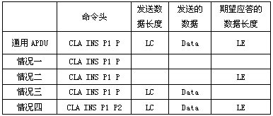 應用層即為由CLA、INS、P1、P2、P3作為命令頭組成的命令消息體的APDU響應和應答處理層。其中CLA為指令類別,INS為指令碼,P1、P2為參數,P3為根據APDU的不同格式為發送給卡的數據長度或期望響應的數據長度。APDU的幾種情況如表2.2所列。