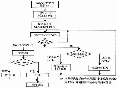 根據目前CPU卡的常用T=0協議、自帶編程升壓電路的應用情況,以及本讀寫器接收IC卡數據報文直接發送PC機處理的特點,本讀寫器可行的APDU命令和響應的處理流程如圖2.3所示。