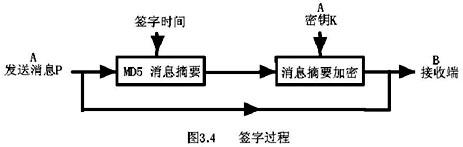 首先A將消息P與簽字時間拼接,形成新用于驗證發送消息的信息,在經過MD5雜湊算法計算出消息摘要,成為用于驗證消息時的消息指紋。同時A使用自己的密鑰K對該消息進行加密后連同原P消息一同發送給B。完成對消息簽字的過程。