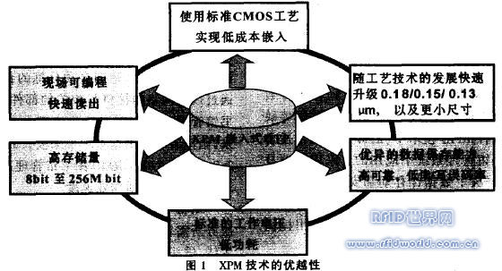 XPM即Super Permanent Memory(超級永久性存儲器),是一種新型不揮發(fā)存儲器(NVM,Non—Vola.tile Memory)技術(shù)。它采用100% 的深亞微米標準CMOS工藝,與制造邏輯電路(CPU,DSP等)相同。XPM—RFID則是將XPM專利技術(shù)應(yīng)用于RFID標簽中,用XPM存儲器替代傳統(tǒng)的EEPROM作為ID碼存儲器件,從而使XPM存儲器的優(yōu)勢得到集中的體現(xiàn)。