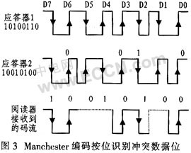 為了防止數(shù)據(jù)沖突的發(fā)生,首先確定發(fā)生沖突的數(shù)據(jù)比特位的具體位置。這里使用Manchester編碼如圖3所示。這種編碼通過電平的上升沿和下降沿表示高、低電平。上升沿為邏輯"1",下降沿為邏輯"0",不存在狀態(tài)不變的情況。因此數(shù)據(jù)傳輸過程中檢測到編碼狀態(tài)不跳變,則認為在數(shù)據(jù)傳輸過程中發(fā)生了沖突。兩個發(fā)生沖突的數(shù)據(jù)比特位必定有一個為邏輯"0",另一個為邏輯"1",這樣Manchester碼的上升沿和下降沿相互抵消,使接收器在持續(xù)時間內(nèi)接收到狀態(tài)持續(xù)不變的副載波信號,即出現(xiàn)狀態(tài)不跳變,這在Manchester編碼中是不允許的,可以肯定該處出現(xiàn)了沖突。因此可以用這種方法按位跟蹤發(fā)生沖突的數(shù)據(jù)比特位的具體位置。