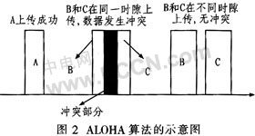 ALOHA算法足一種簡便的防沖突算法,如圖2所示。它既沒有檢測機制也沒有恢復(fù)機制,只是以一定概率確保電子標簽發(fā)出的信息準確地被閱讀器接收。ALOHA算法僅用于只讀閱讀器,標簽將數(shù)據(jù)(序列號)傳輸給閱讀器,并且在一個周期中將數(shù)據(jù)不斷發(fā)送給閱讀器,數(shù)據(jù)傳輸時間只是重復(fù)時間的一小部分,使得在傳輸中產(chǎn)生相當(dāng)長的間歇,因此,存在一定概率,使兩個應(yīng)答器可以在不同的時隙傳輸其數(shù)據(jù),從而避免沖突。