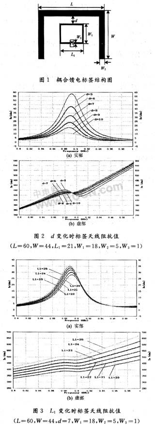 本文同樣采用電磁耦合饋電結(jié)構(gòu),針對(duì)Philips公司的SL3S3001 FTT芯片設(shè)計(jì)了一種結(jié)構(gòu)簡(jiǎn)單,阻抗匹配方便,在867 MHz和915 MHz均出現(xiàn)頻率諧振點(diǎn),具有較強(qiáng)的實(shí)用價(jià)值的標(biāo)簽天線。設(shè)計(jì)時(shí)采用Zeland公司的IE3D軟件進(jìn)行仿真實(shí)驗(yàn),介質(zhì)板采用工業(yè)上最常用、價(jià)格又低廉的FR4敷銅板,其厚度為1.6 mm,敷銅厚0.03 mm,介電常數(shù)4.7。
