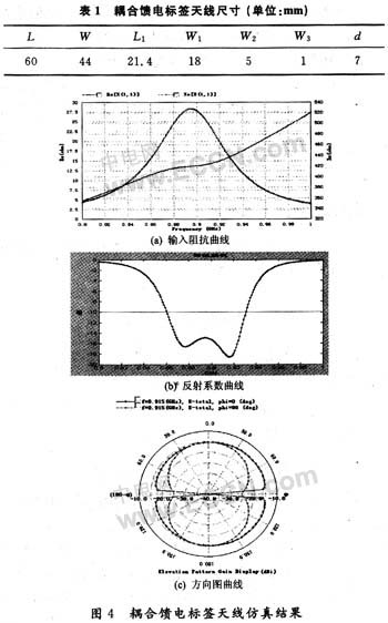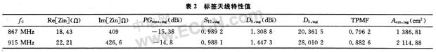在實(shí)際制作天線前,我們先對(duì)仿真結(jié)果進(jìn)行了評(píng)價(jià)分析。由于IE3D軟件模擬分析得到的天線增益是建立在系統(tǒng)特征阻抗為50 Ω的系統(tǒng)上的,而本文所設(shè)計(jì)的標(biāo)簽天線是輸入阻抗為與芯片阻抗共軛匹配,因此模擬分析結(jié)果需要對(duì)天線正規(guī)化才能得到正確的方向性(D0)與有效接收面積。