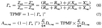 其中λ0=c/f本文天線設(shè)計(jì)主要針對(duì)阻抗做最大功率轉(zhuǎn)移匹配,由式(6)標(biāo)簽芯片與標(biāo)簽天線阻抗介面的反射系數(shù)(Γta),定義功率不匹配因數(shù)(Tag Power Mismatch Factor,TPMF)為式(7),當(dāng)阻抗為共軛匹配時(shí),TPMF為1。